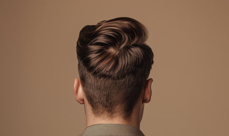 A man with chestnut brown hair on neutral background, back view