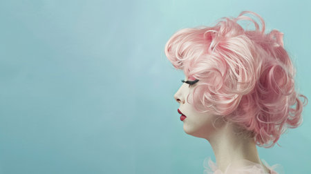 Woman with vibrant pink hair and bold makeup poses elegantly against a turquoise background, exuding beauty and style