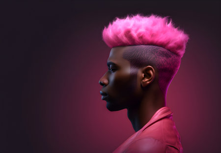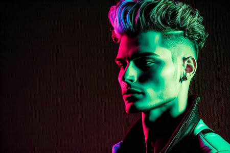 Fashion editorial Concept. Closeup portrait of stunning handsome man with chiseled features, pink hair and leather jacket. illuminated dynamic composition and dramatic lighting