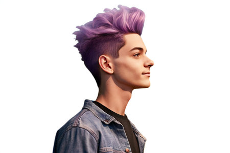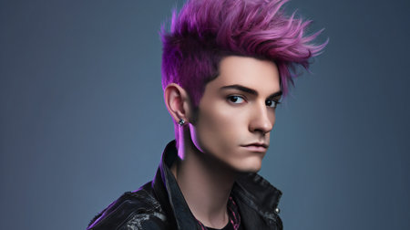 Profile view of a handsome young man with purple hair on blue background