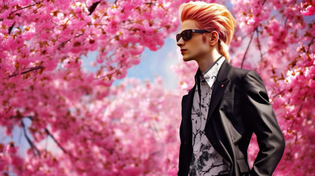 Fashion shot of a handsome young man in elegant suit and sunglasses posing in a blooming spring garden.
