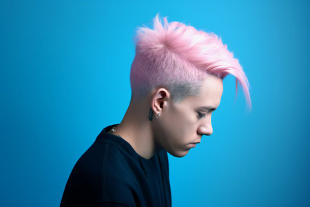 Colorful hair, modern hairstyle, artistic portrait of a man with pastel pink and blue hair against a soft gradient background, showcasing individuality and style