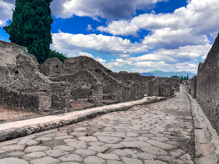 POMPEII, ITALY - MAY 04, 2022 - A beautiful typical cobbled street in the ancient city of Pompeii, Southern Italy