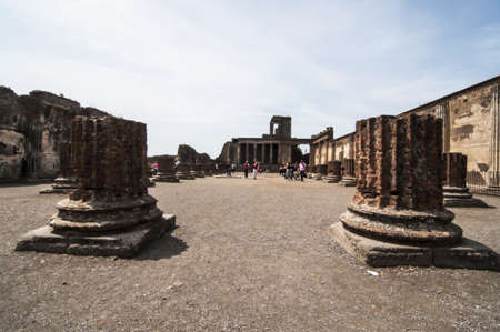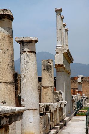 Columns in the forum in the ruins in the once buried city of Pompeii Italy