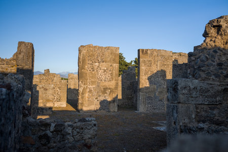 Tall weathered stone walls of ancient ruins stand under clear blue sky in the archaeological quarters of Pompeii, Italy. Warm sunlight casts dramatic shadows, revealing textured volcanic masonry and distant mountain peaks.