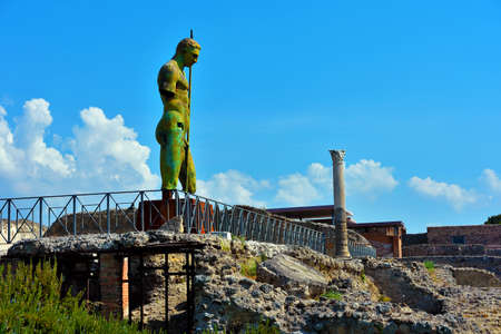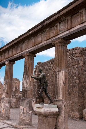 Ruins of the ancient Temple of Apollo with bronze Apollo statue in Pompeii