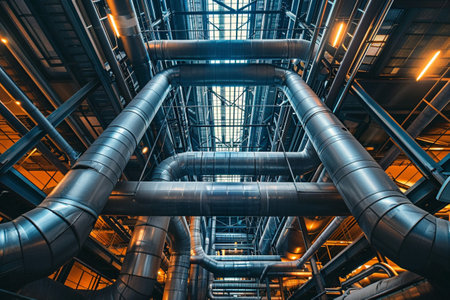 A detailed view of an industrial factory interior showcasing a complex network of large metal pipes and ducts. The pipes are arranged in a structured yet intricate manner, highlighting the industrial infrastructure.