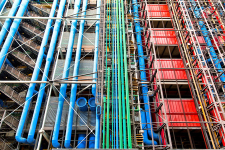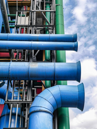 External colorful metal tubing of the Centre Georges Pompidou in Paris, France