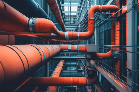 Intricate plumbing system showcasing vibrant red pipes traversing a modern industrial building, highlighting the essential infrastructure