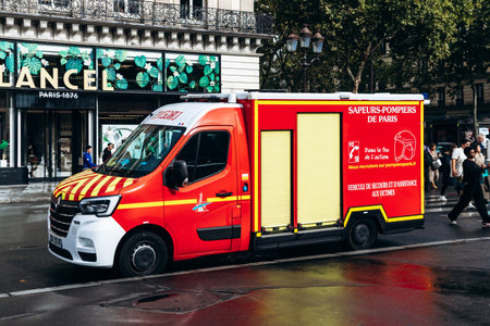 Paris, France - September 11, 2025: Fire rescue vehicle in central Paris near Opéra