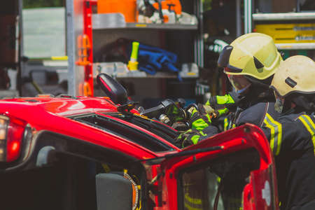 Firefighters using a hydraulic jaws of life or scissors to cut the crashed car open to save the driver caught inside. Emergency situation in a road crash