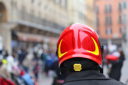 Watch fireman with red Hardhat controls the people of the city during the protest March