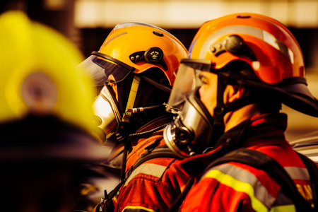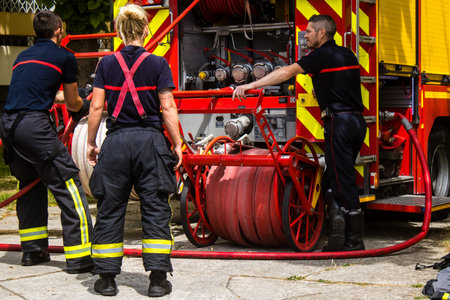 Group of fire men in protective uniform during fire fighting operation in the city streets, firefighters brigade with the fire engine truck vehicle in the background, emergency and rescue service