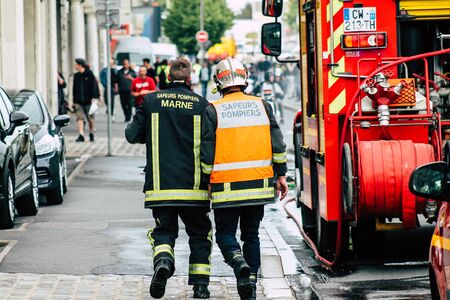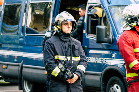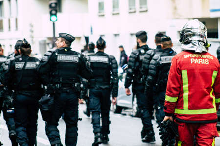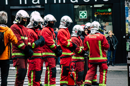 Paris France May 04, 2019 View of a French firefighters walking in the street during protests of the Yellow jackets against the policy of President Macron in Paris on saturday afternoon