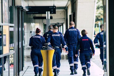 Paris France October 24, 2019 View of French police customs officers walking in CDG airport in the afternoon