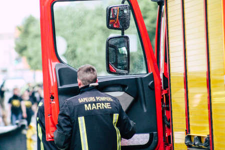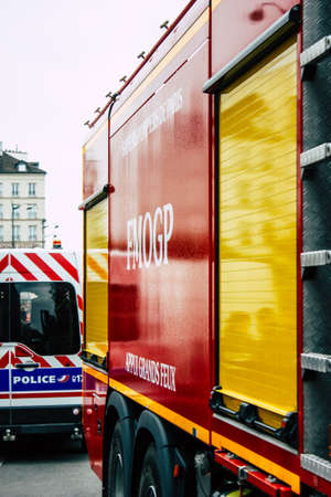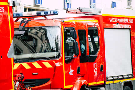 Paris France May 25, 2019 View of French fire engine parked in the streets of Paris in the afternoon