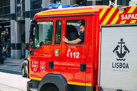 Lisbon Portugal july 26, 2020 View of a fire engine in the streets of Lisbon, the hilly coastal capital city of Portugal and one of the stunning oldest cities in Europe