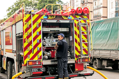 Dnepropetrovsk, Ukraine -09.20.2021: Fire on the top floor of a five-story building. Work of the operator of the water and foam control panel during fire extinguishing.