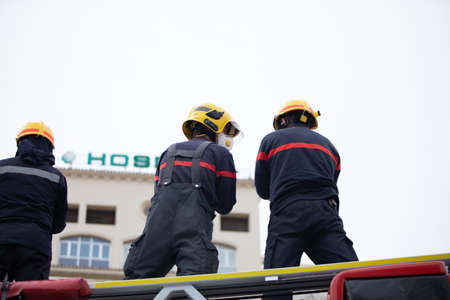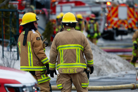 Firefighters and firemen in action during a fire drill at a construction site. Quebec City firefighters on call for a fire