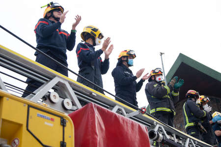 Malaga, Spain. 16th Apr 2020. Covid-19 Tribute applause to health personnel of the Hospital Carlos Haya of Málaga from local Police and Firemen.