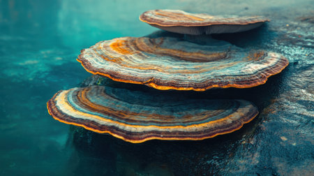 A cluster of colorful turkey tail mushrooms displays a spectrum of vibrant hues. The intricate patterns create a visually stunning natural artwork.