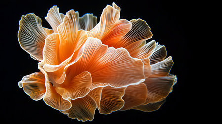 A close-up view of an abstract, organic form resembling a flower or fungus, showcasing layered, translucent orange petals with fine, radiating white veins.