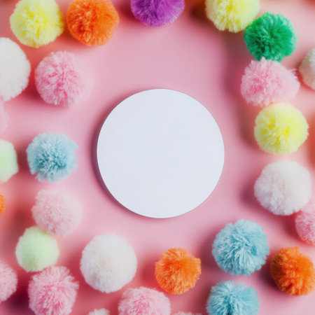 Bright and vibrant pom poms in various colors surround a blank white circle on a soft pink surface. This setup is ideal for crafting, invitations, or creative projects.