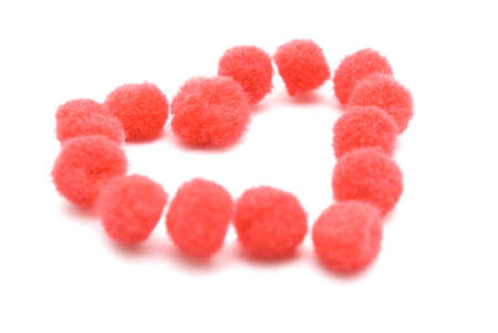 A heart shape made up from assembled red fluffy pompom balls. White background.