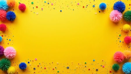 Colorful pom poms and glitter frame on mustard background