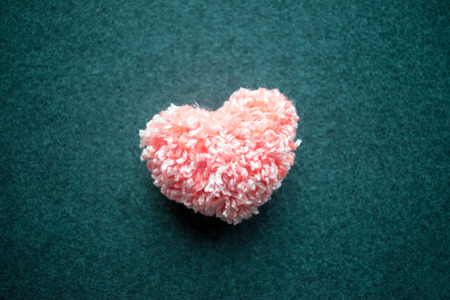 Fluffy pink thread heart on gray felt background. Handmade pretty heart. Love, romance, Valentines day DIY concept. Selective focus