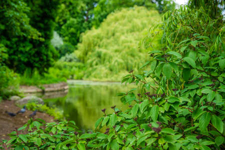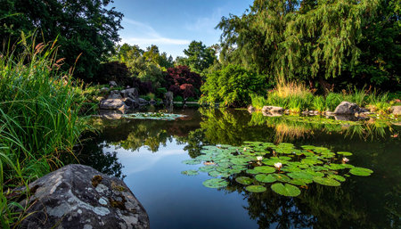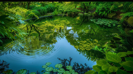 A tranquil garden scene showcasing lush greenery surrounding a serene pond. Soft reflections on the water create a peaceful atmosphere perfect for relaxation.