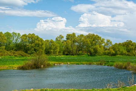 Bright summer panoramic landscape with beautiful lake and green hills during sunny day.summer landscape with field, lake and trees, reflection and cloudy sky.
