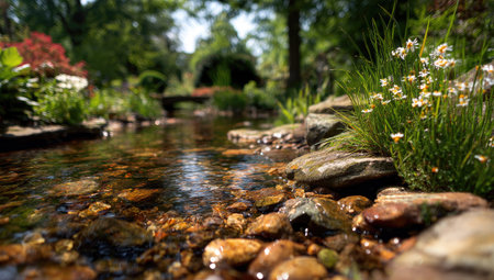 A close-up captures a shallow stream flowing through a garden, showcasing clear water and various sizes of rocks. The scene features lush greenery, including grass and flowers, and the natural light creates a bright, serene atmosphere. The image is suitable for illustrating nature, relaxation, and environmental themes.