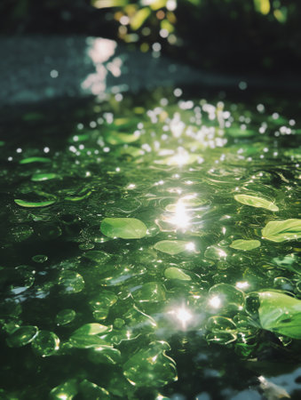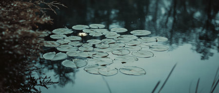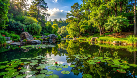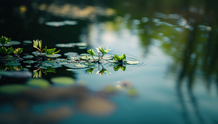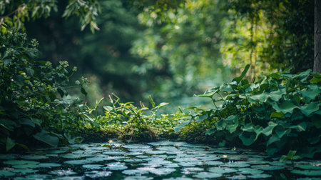 A tranquil pond with floating lily pads, surrounded by dense greenery, captured in soft natural sunlight, evoking a peaceful and serene atmosphere.