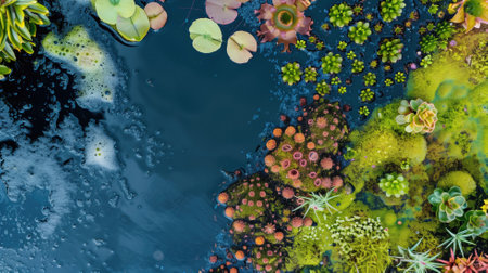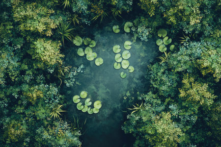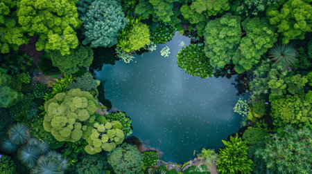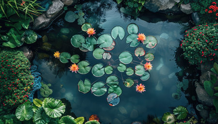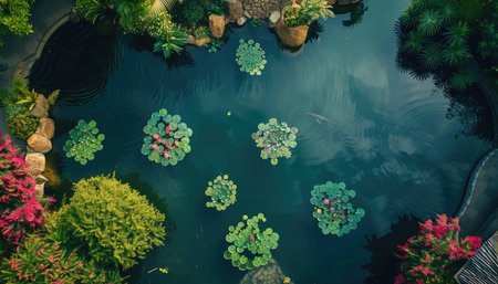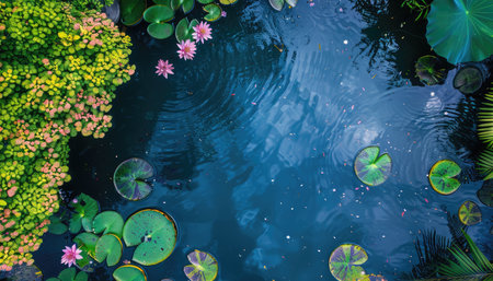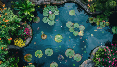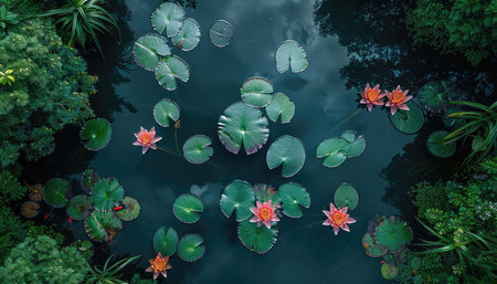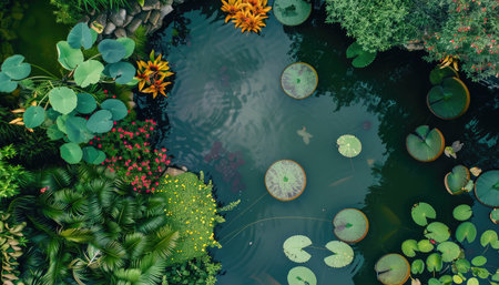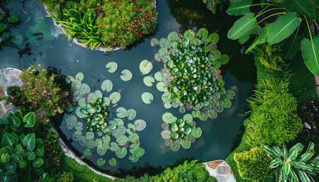 An aerial view captures a tranquil pond adorned with vibrant water lilies and lush tropical plants. This serene natural scene invites relaxation and reflection.