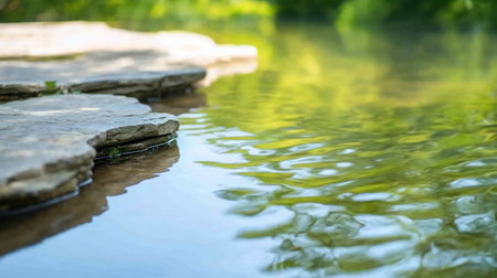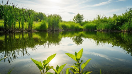 Beautiful spring pound scene, close up fresh water with copy space, splash screen for pc. outdoor horizontal nature background. AI generative image.