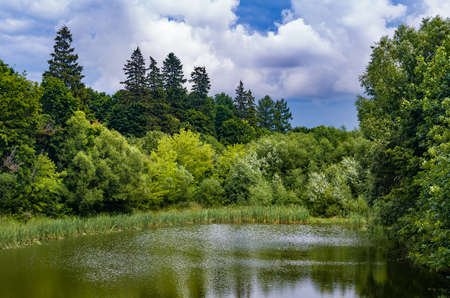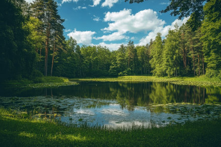 Serene pond nestled in a lush green forest with blue sky and white clouds reflecting on the water.
