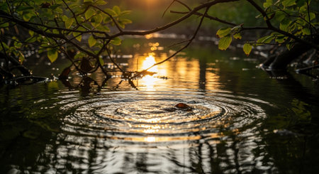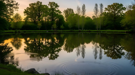 A serene landscape featuring a calm pond with circular ripples spreading across the water's surface. The setting sun casts a warm glow on the surrounding trees, whose reflections are mirrored in the water, creating a peaceful and idyllic atmosphere.