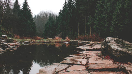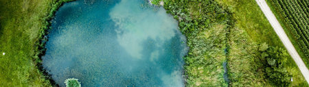 the serene pond, viewed from above, showcases a stunning flat, duotone color scheme, reflecting the beauty of nature, with its calm waters and lush green surroundings, perfect for relaxation and tranquility, evoking feelings of peacefulness and connection with the natural world. ai generated