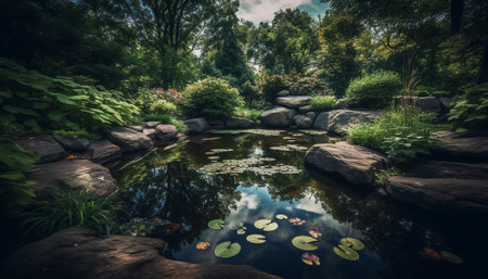 AI Generated. Tranquil Pond With Lush Green Foliage and Stone Stepping Stones in a Sunny Park