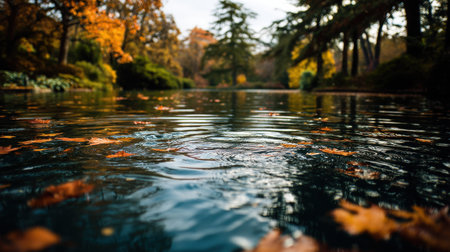 Ripples form on the surface of a peaceful lake surrounded by autumn colors. Leaves float gently on the water, enhancing the serene atmosphere on a cloudy afternoon