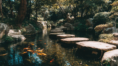 A scenic view captures a stone pathway leading over a pond with visible koi fish. The composition features a natural outdoor setting with lush greenery. The image is rich in color and texture and presents a serene atmosphere suitable for various visual projects.