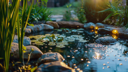 A tranquil pond scene featuring vibrant water lilies and koi fish swimming beneath the surface, captured during soft evening light, evoking calm and serenity.