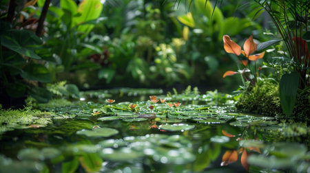 This captivating image features a tranquil garden pond adorned with vibrant water lilies, surrounded by lush tropical foliage, creating a serene retreat in nature.