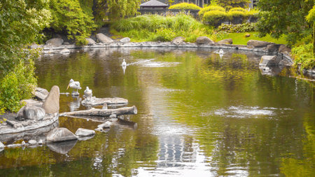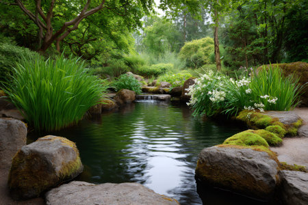 White water lilies blooming on a calm pond in a peaceful Japanese garden surrounded by lush greenery, grass, rocks, and moss