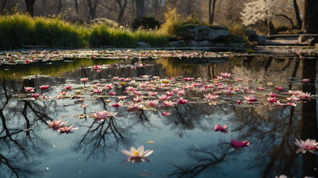 scenic garden pond with water lilies and floating pads, aerial view. 8k. --ar 7:4 --v 6 Job ID: 5c74d663-a398-44ba-b5a5-e09e5500b6f6
