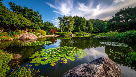 Tranquil Japanese garden with koi pond surrounded by lush greenery and serene landscape