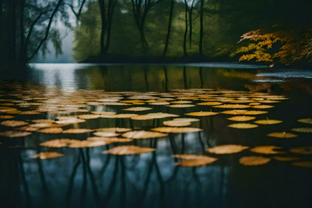 A picturesque view of water lilies floating gracefully on a calm pond, surrounded by vibrant autumn foliage, reflecting the serene beauty of nature.