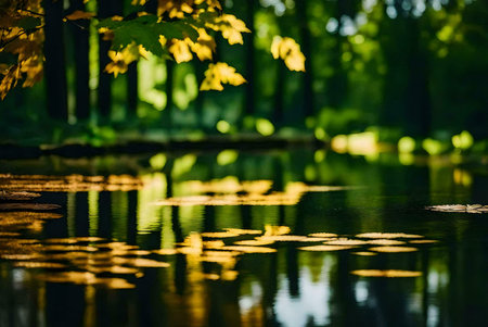 Golden lily pads float on a tranquil lake, their reflections mirroring the surrounding trees and forest. A serene and peaceful autumnal scene.