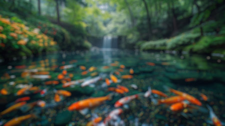 Blur background of luxurious tropical garden with waterfall and koi pond. Digital artwork of waterfall with orange fish pond.. Tranquil nature retreat concept. Design for wallpaper, poster. Spate.